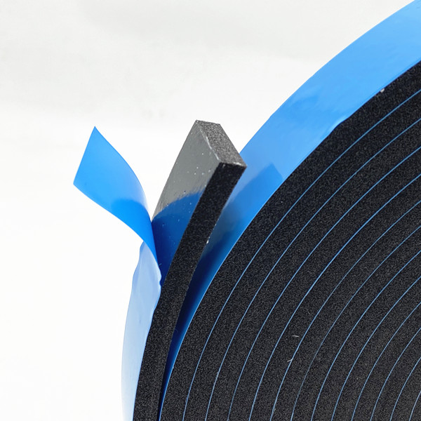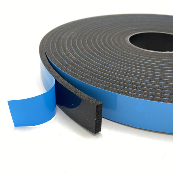 PVC blue film sealed double-sided foam tape is made by 300-400kg/m3 density PVC foam. The foam sealant combines a closed-cell polyvinyl chloride foam substrate with a pressure-sensitive adhesive on both sides.